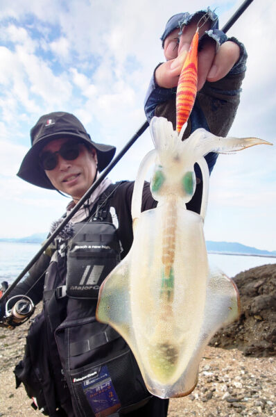 エギンガーによる永遠の悩みドコロは「エギのカラー」 今回訪れた瀬戸内海の磯や堤防。 晴れ続きにもかかわらず、意外に濁っていた印象。 朝一番はローライトということもあり、ヒロセマンとシバターが選んだエギは餌木蔵シュリンプ2.5号の夜光オレン