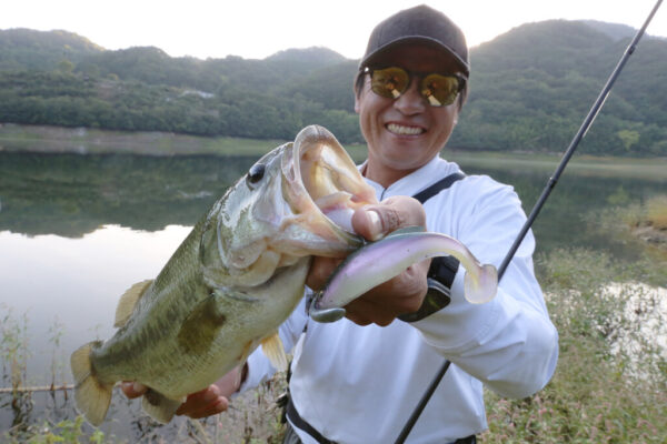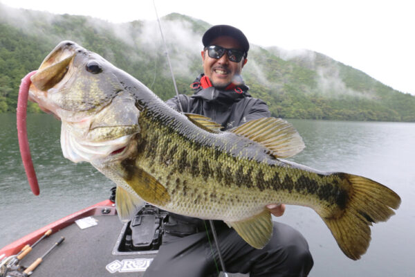 モンスターバスの本能をアオりマクるのは、ロングワームの水面ワッキー 季節柄というか、場所柄というか、メインになった展開が、ロングワーム・アジャストレート12inchの表層アプローチ。 カナモがメインに据えたアジャストレート12inchはFATの