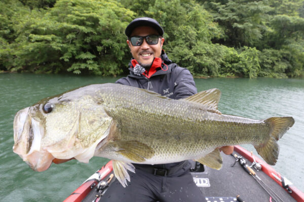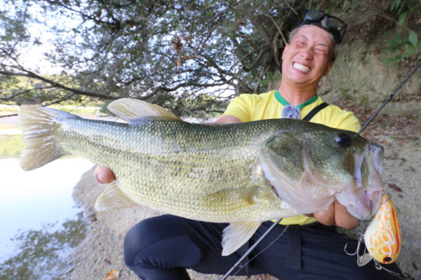プライベート寄りのロケでテストしたのがベイトフィネスPE 状況が落ち着いたあと、浮きチップの下にデカバスが付いているのを見抜いたカナモ。 ここで取りだしたのはベイトタックルだが、セットしたルアーはカバーネコ。 少し前から練習していたベイト