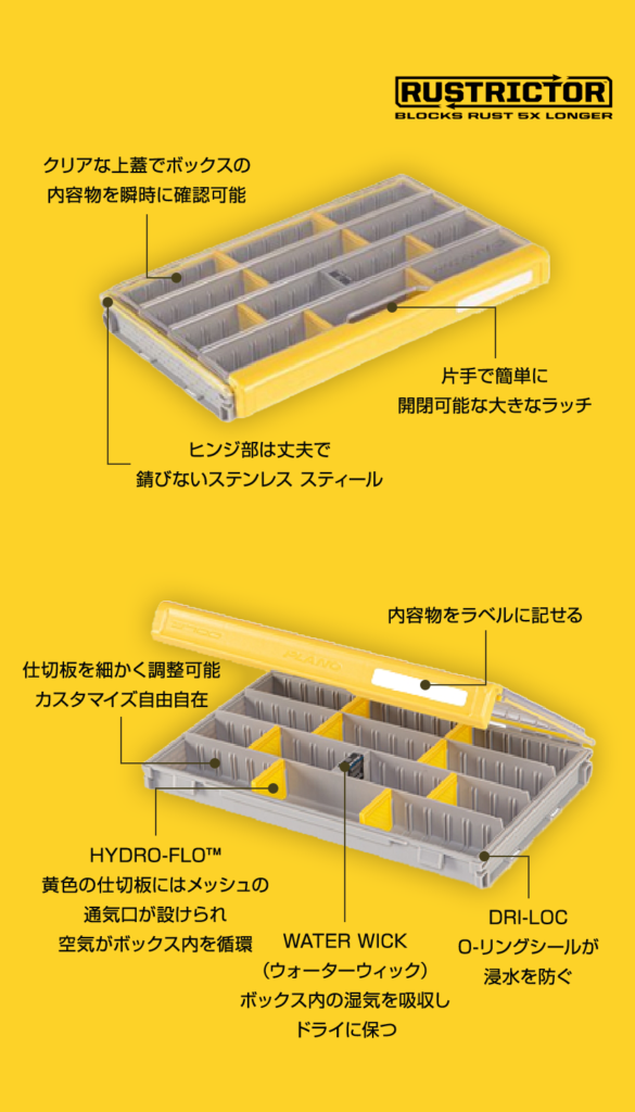 プレカットされた通気性のある仕切りを備えた革新的なシステムを特徴とするこの機能的なタックルボックスには、Dri-Loc防水シール、吸水性乾燥剤を備えています。中身をすぐに識別できるDura View (透明なポリカーボネイト製の上蓋)や、片手で簡単に開閉できる特大ラッチで使いやすさを追求した設計になっています。同サイズの複数のユニットを積み重ねられるように設計されており、リブ付きの蓋とベース、スチール製のピンヒンジは、耐久性があり掴みやすく簡単に開閉することが可能です。