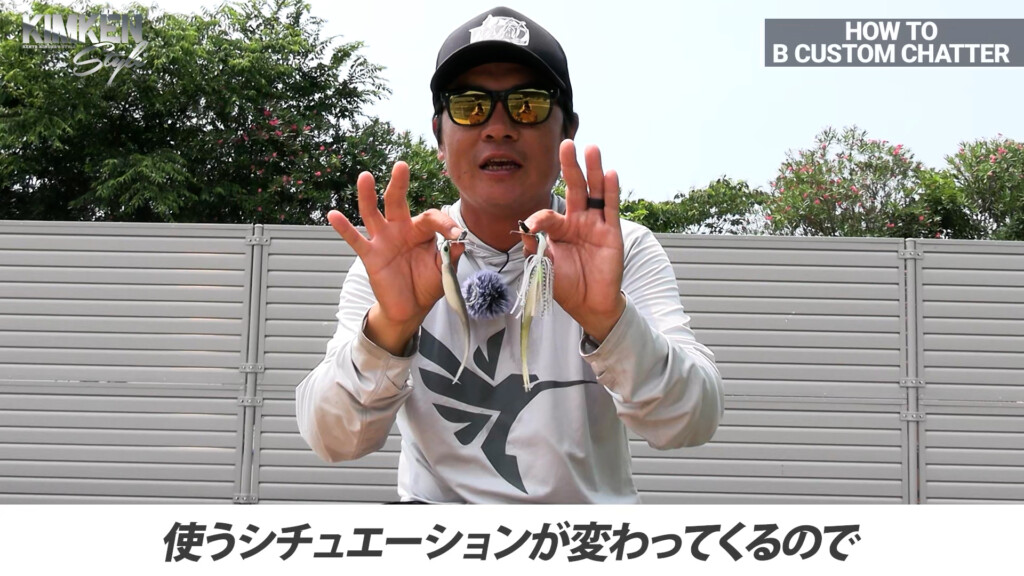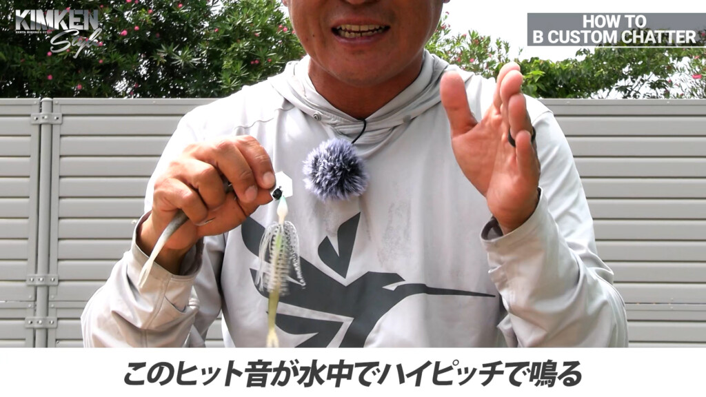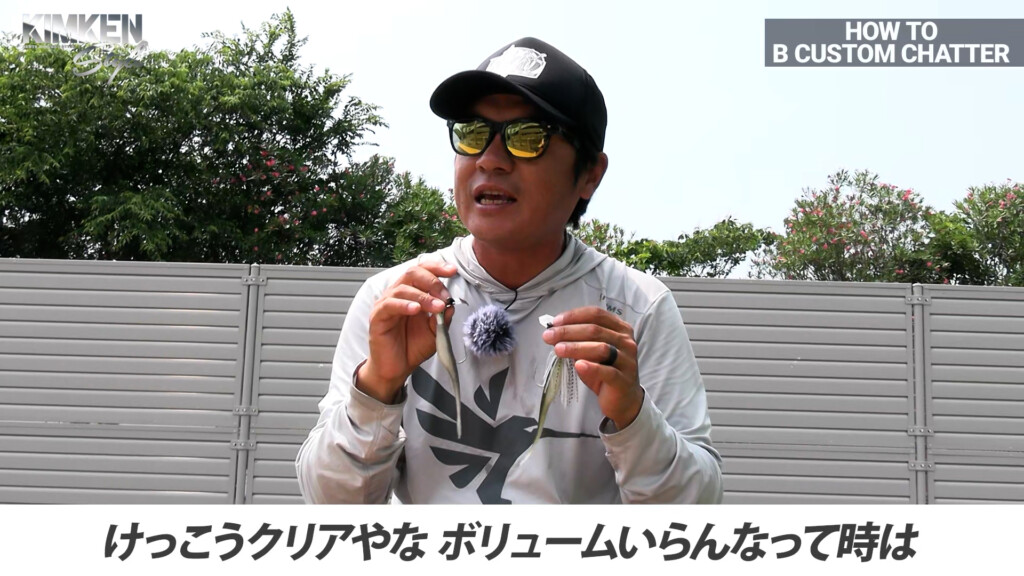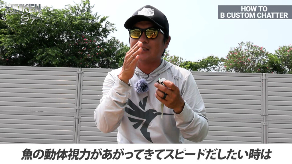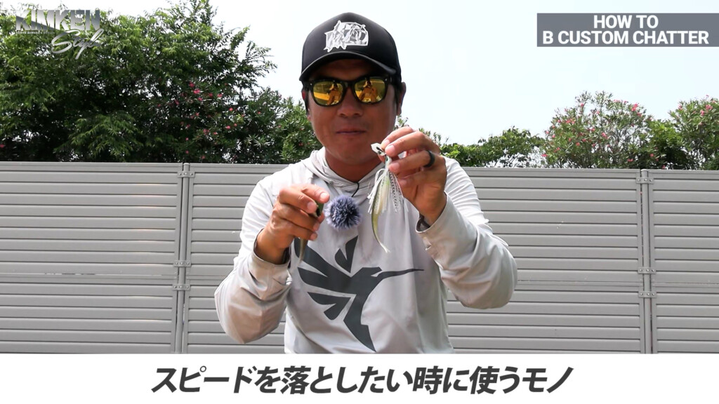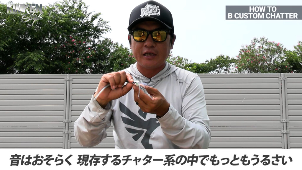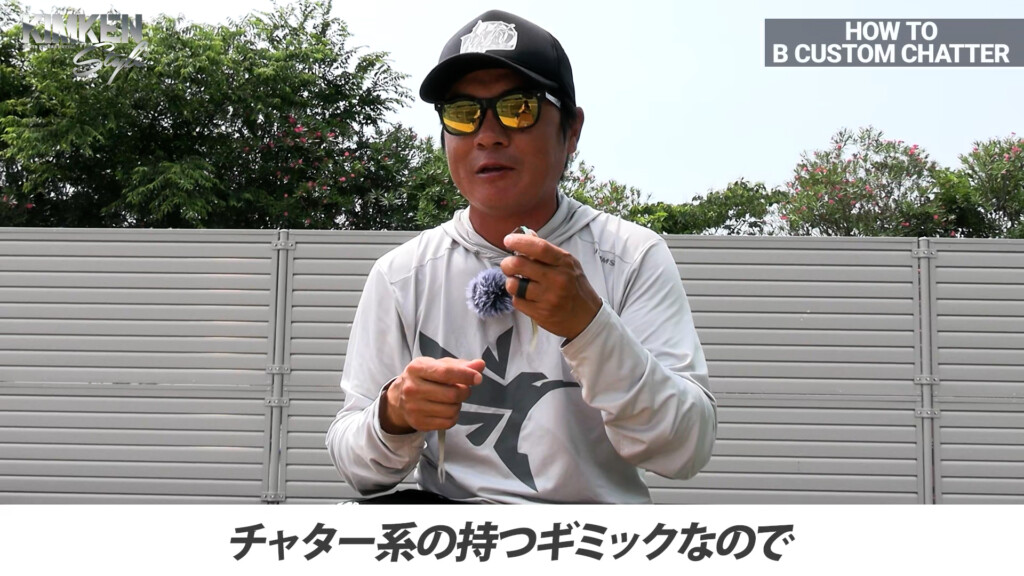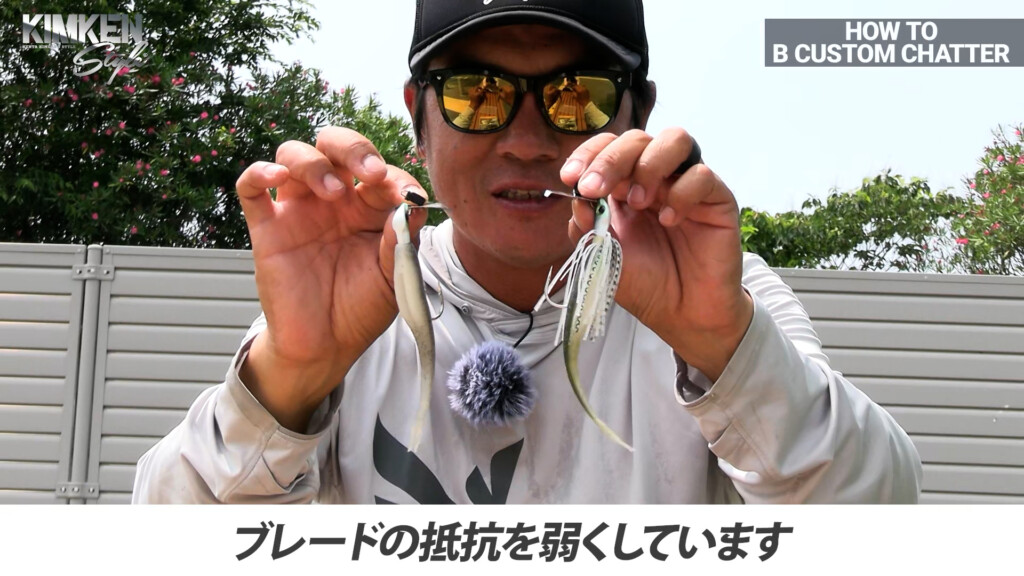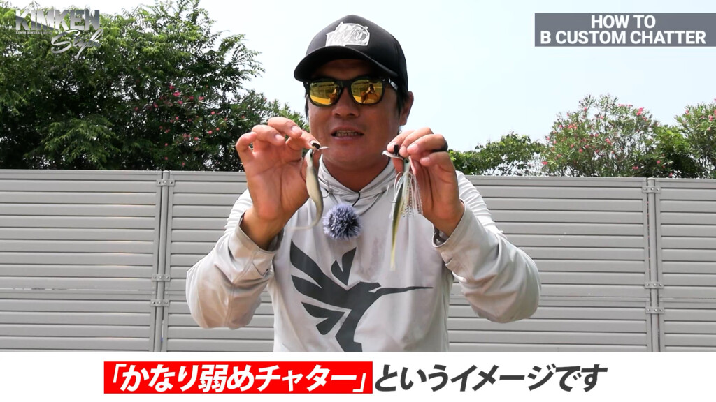 Bカスタムチャターなどのチャター系は、水を受けるブレードがアクションを発生させるリップであり、このブレードが受ける抵抗感を強くしたり弱くしたりすることで、ボディ本体に伝える振動を調整できるとのこと。