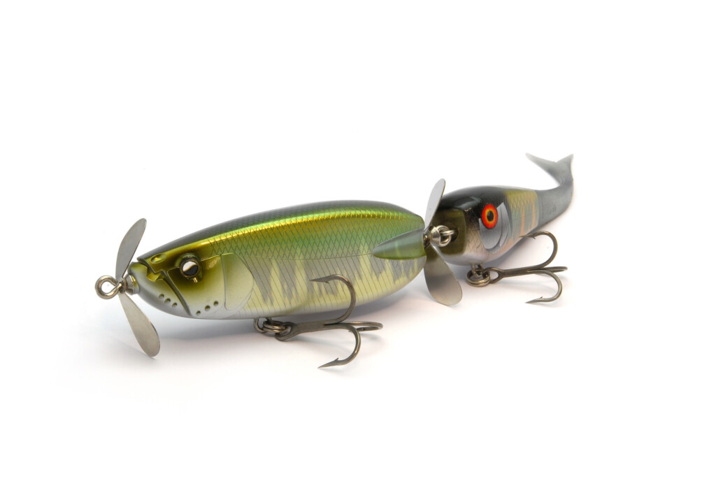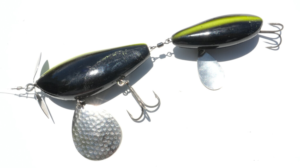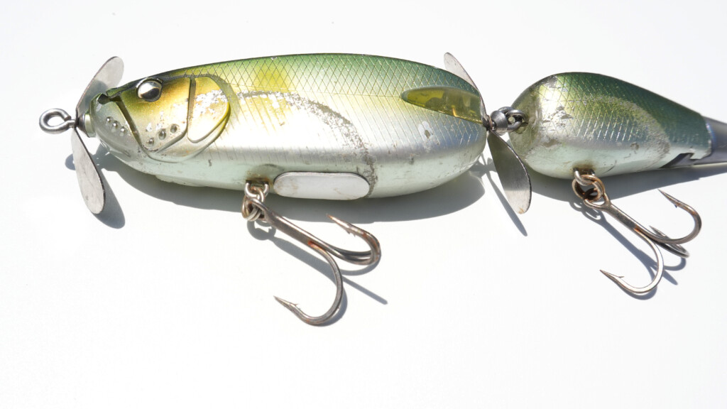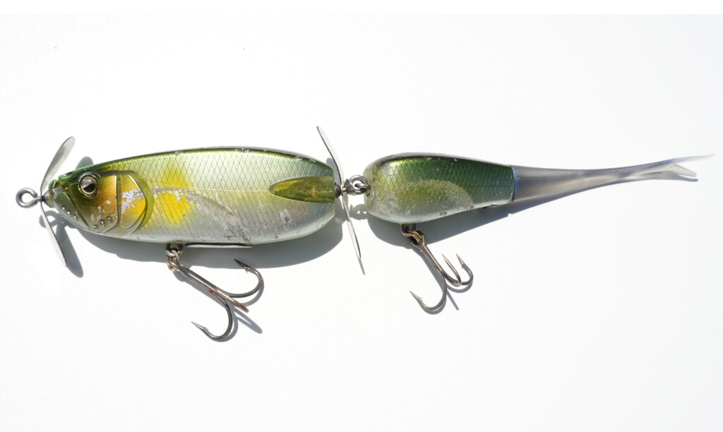 DOUBLE HEADERは、ボディフロントとジョイント部にペラを設置した、これまでにないまったく新しいスタイルのダブルスウィッシャー型ジョイントビッグベイトです。ストレートリトリーブでは前後のペラが回転するi字系大型ダブルスウィッシャーとして水面からサブサーフェスのレンジをトレースできます。(板オモリによるウェイト調整で任意のレンジをトレース可能)
