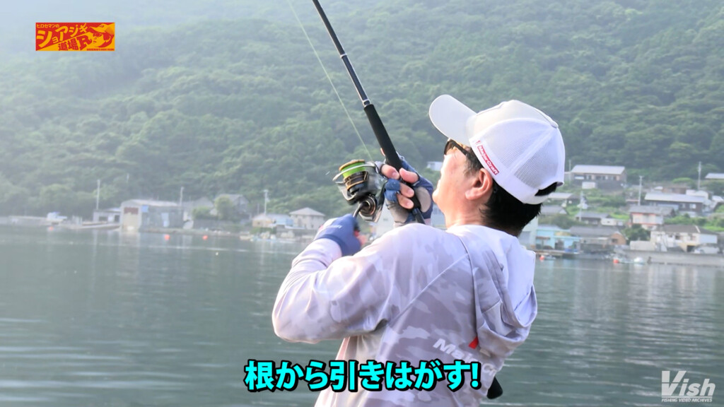 掛けて底から引きはがすようにゴリ巻きする際、ロッドのバットパワーとリアグリップの長さ、しっかりホールディングできるかなどが試される。