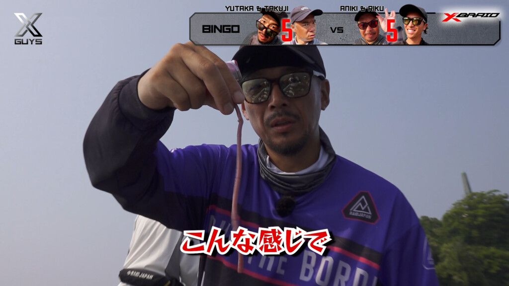 おねむなアニキも心機一転、ロングワーム「アジャストレート12inch」のフリーリグでお題の魚を狙い撃つ。