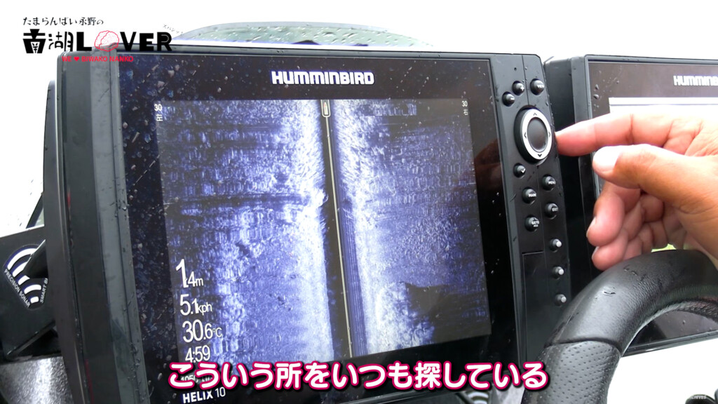 雨から逃げながら再び南エリアのウイードエッジへ。ここで魚探を使った見方を紹介。
