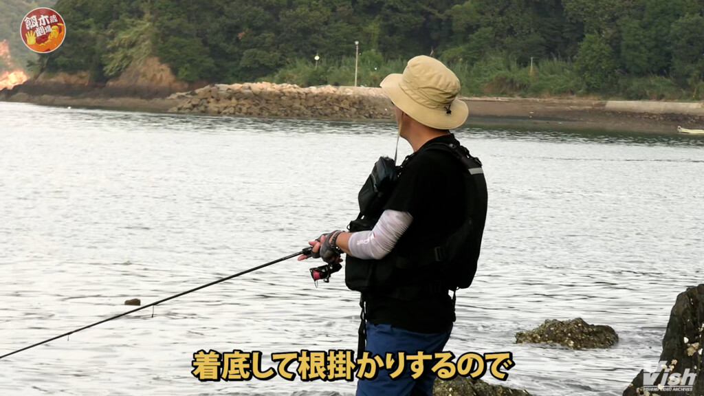 ロッドを低く構えたままだとエギが着底した際に根掛かりしやすくなる。