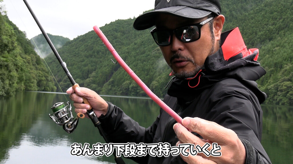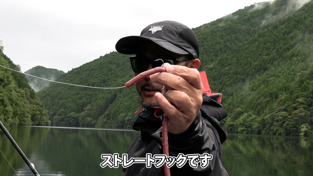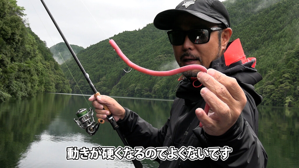 通し刺しでセットするワケだが、フックの位置はあまり下の方まで持っていくとワームのアクションが損なわれるので注意!