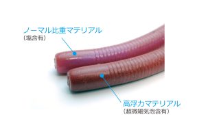 塩入りノーマル比重マテリアル・・・ナチュラルな沈下速度を生み出す絶妙な比重感 に設定。ノーシンカーワッキーでフォールさせればウネウネと自発的にうごめき魚 を誘い、アクションを加えればゆったりとした余韻のあるウネリを発生。ボトムに 放置するだけで誘い続けるオートマチック設計です。高浮力マテリアル・・・浮力が高ければ良い訳でもないため、フックを背負った状 態で「浮きすぎない」絶妙な浮力感に設定。太さと長さによる張り感の差と、水 面という壁をウマく利用して気難しい魚をもバイトに持ち込む類稀なるバイト誘 発力があなたの新たな武器になるでしょう。