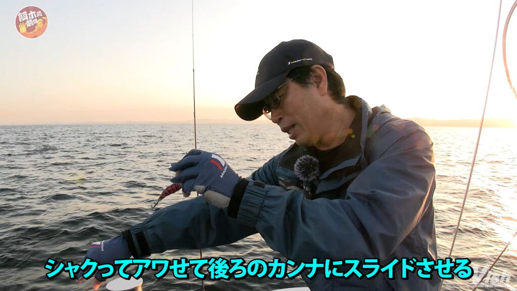 底まで落としてシャクって誘い、エギの動きをピタっと止めて抱かせるティップランエギング。