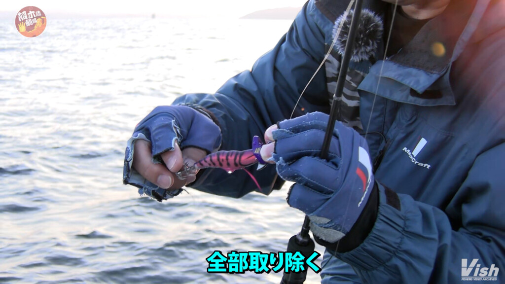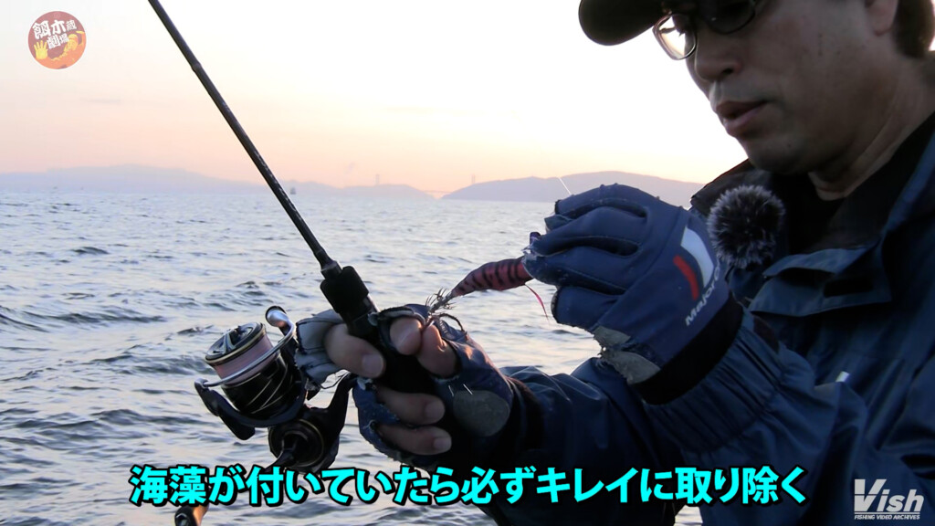 そして、船からでも岸からでも同じく、水深が深くても浅くても、エギに海藻などの付着物が付いていたら必ず取り除くこと。