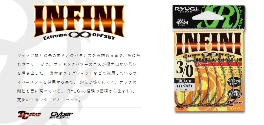 ベンドは伸びに対する高い復元力を有し、クランクはフッキング時にワームがズレやすく、 フッキング率を高める。 更に、ストレートフックの逸品、タントラムコントロールで培った ノウハウを注入。ギャップ幅と鈎先の向きとのバランスを煮詰める事で、魚に触れやすく、 かつ、フッキングパワーのロスが極力出ない形状を導き出した。 素材はフォグショットなどで採用しているサイバーメタルを採用する事で、 鈎先が鈍りにくく、フックの剛性を更に高めている。 RYUGIの経験の蓄積から生まれた、 究極のスタンダードオフセット。
