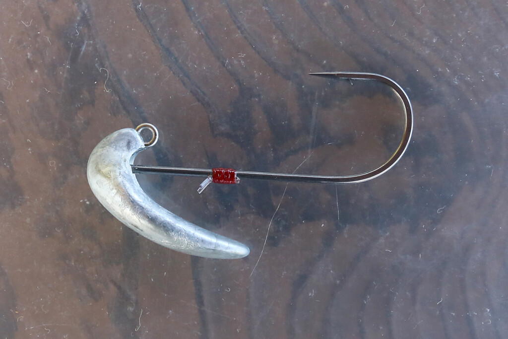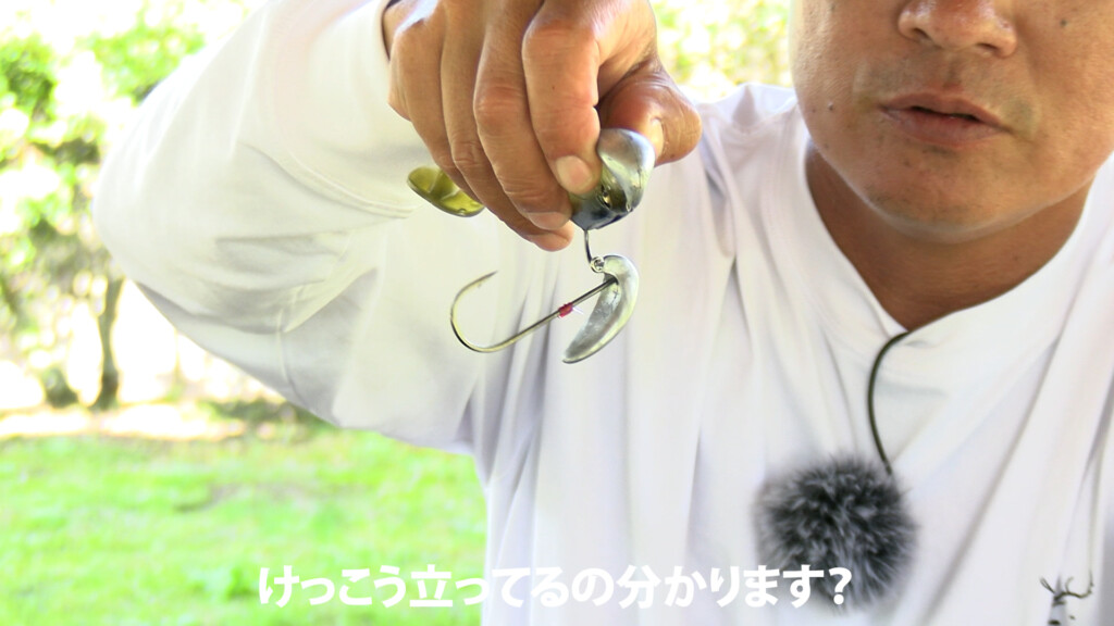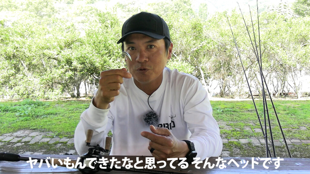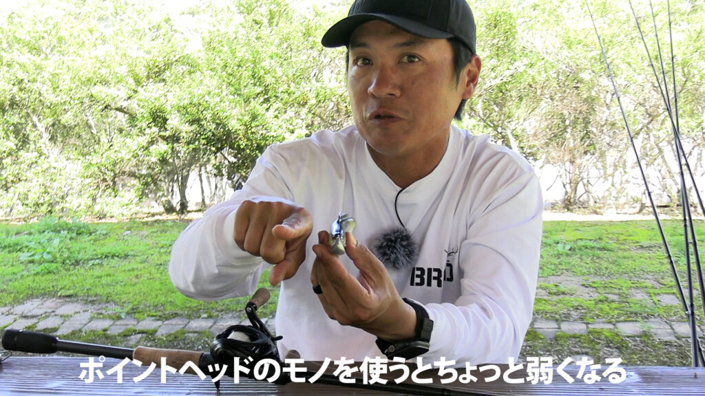 このマグドラフト・フリースタイルで独特のヘッドシェイクを演出するとなると、ヘッドの先端にアイが付いている(ポイントヘッド)一般的なジグヘッドでは支点も変わって動きが弱くなるとのこと。