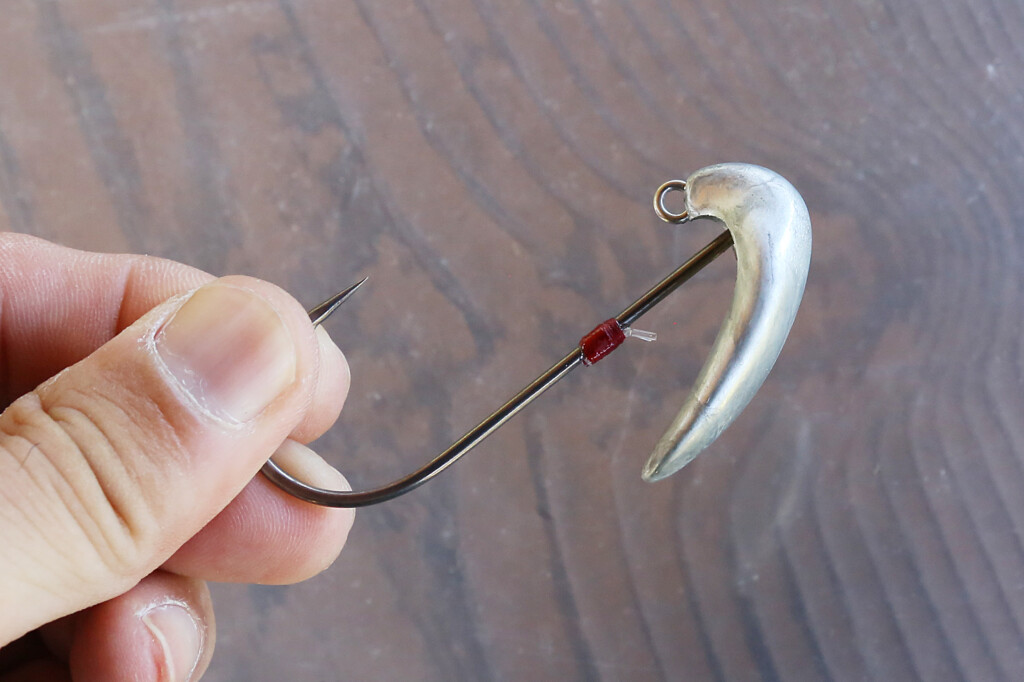 このマグドラフト・フリースタイルで独特のヘッドシェイクを演出するとなると、ヘッドの先端にアイが付いている(ポイントヘッド)一般的なジグヘッドでは支点も変わって動きが弱くなるとのこと。