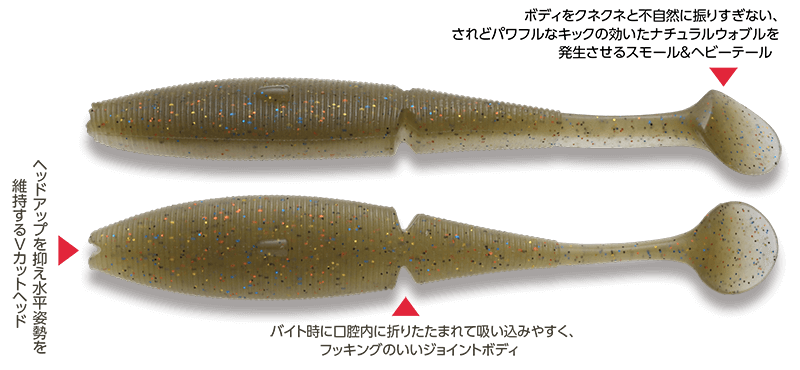 そこで今、世の中にあるものを作っても仕方がないので、このルアーで目指したのが『ノーシンカーでボトムにコンタクトさせながら巻ける』。これがほかのシャッドテールワームとは違う新しい性能です」。テールアクションを前ボディに伝えるとヘッドが上がり浮きやすくなってしまう。それを防止するためにジョイント構造にして、前ボディに動きを伝えにくくしている。ジョイント部の下面にフラット面を作ることで、ここに水を受けてテールを上げ、強制的にヘッドを下げさせる役割を担っている。