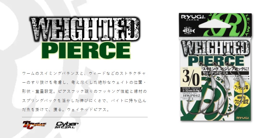 ピアスフックにウェイトを持たせ、シャッドテール・スティックベイト等でのナチュラルなスイミングや、ツインテールグラブ等の表層バジンフロッグに対応するようチューニング。 ワームのスイミングバランスと、ウィードなどのストラクチャーのすり抜けを考慮し、考え尽くした絶妙なウェイトの位置・形状・重量設定。 ピアスフック譲りのフッキング性能と線材のスプリングバックを活かした伸びにくさで、バイトに持ち込んだ魚を掛けて、獲る。 ウェイテッドピアス。