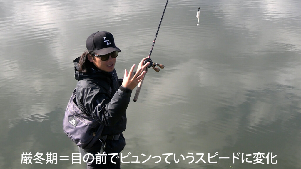 つまり、秋はバスがエサを果敢に追いかけるスピード感が大事で、冬はバスの目の前を瞬間的に駆け抜けるスピードがバイトにつなげやすい。