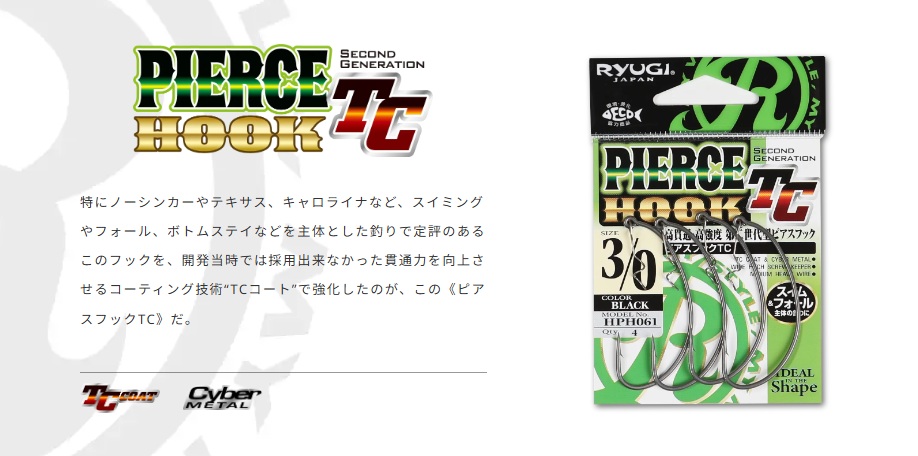 全体的に曲線を描く特徴的なワイドギャップシルエットと、バイト時にワームをズレさせる為の特殊ワームキーパー採用で、高い強度とフッキング率を誇るピアスフック。 特にノーシンカーやテキサス、キャロライナなど、スイミングやフォール、ボトムステイなどを主体とした釣りで定評のあるこのフックを、開発当時では採用出来なかった貫通力を向上させるコーティング技術“TCコート”で強化したのが、この《ピアスフックTC》だ。後悔の残る釣りは、したくない。その為に、出来る限りの手を尽くす。RYUGIの想いがこもった第二世代フック。是非、体感して頂きたい。