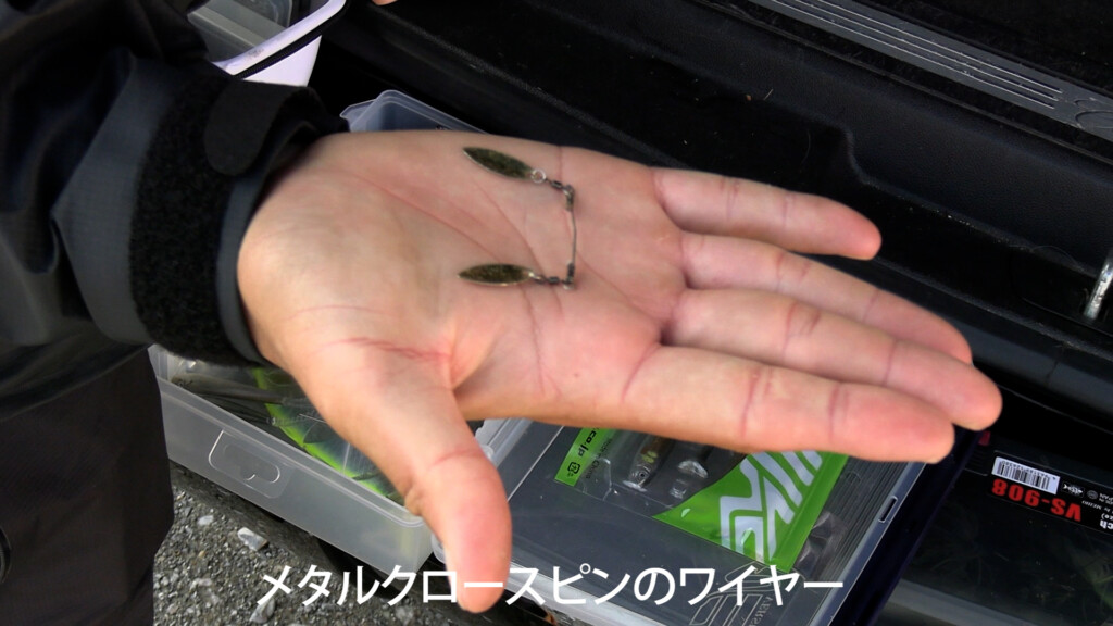 おもむろに取りだした小型ブレードは、メタルクロースピンのワイヤー付きブレード。