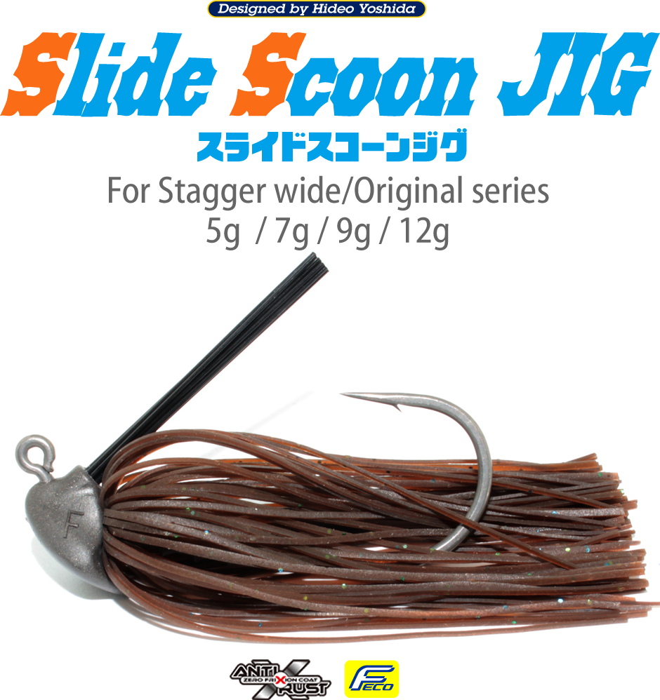 スライドフォールジグと比較するとフックサイズが4/0にアップ、ウィードカードも強めに設定。スタッガーワイドをトレーラーにしたフォールやスタッガーオリジナルをトレーラーにしたスコーンでの使用が最適。太軸フックの採用によりウィードエリアやカバー狙いのパワーフィッシングなどにも広範囲に対応。