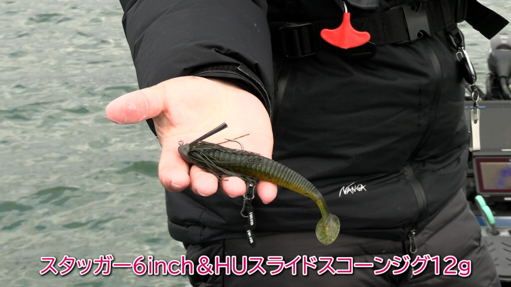 たまらんばい永野の場合、スイムジグのメインは17g前後だが、今年は水位が低くて沖のウイードトップも高い(水深4mでトップが3ー3.5m)今回は12gに6inchトレーラーをセレクト。